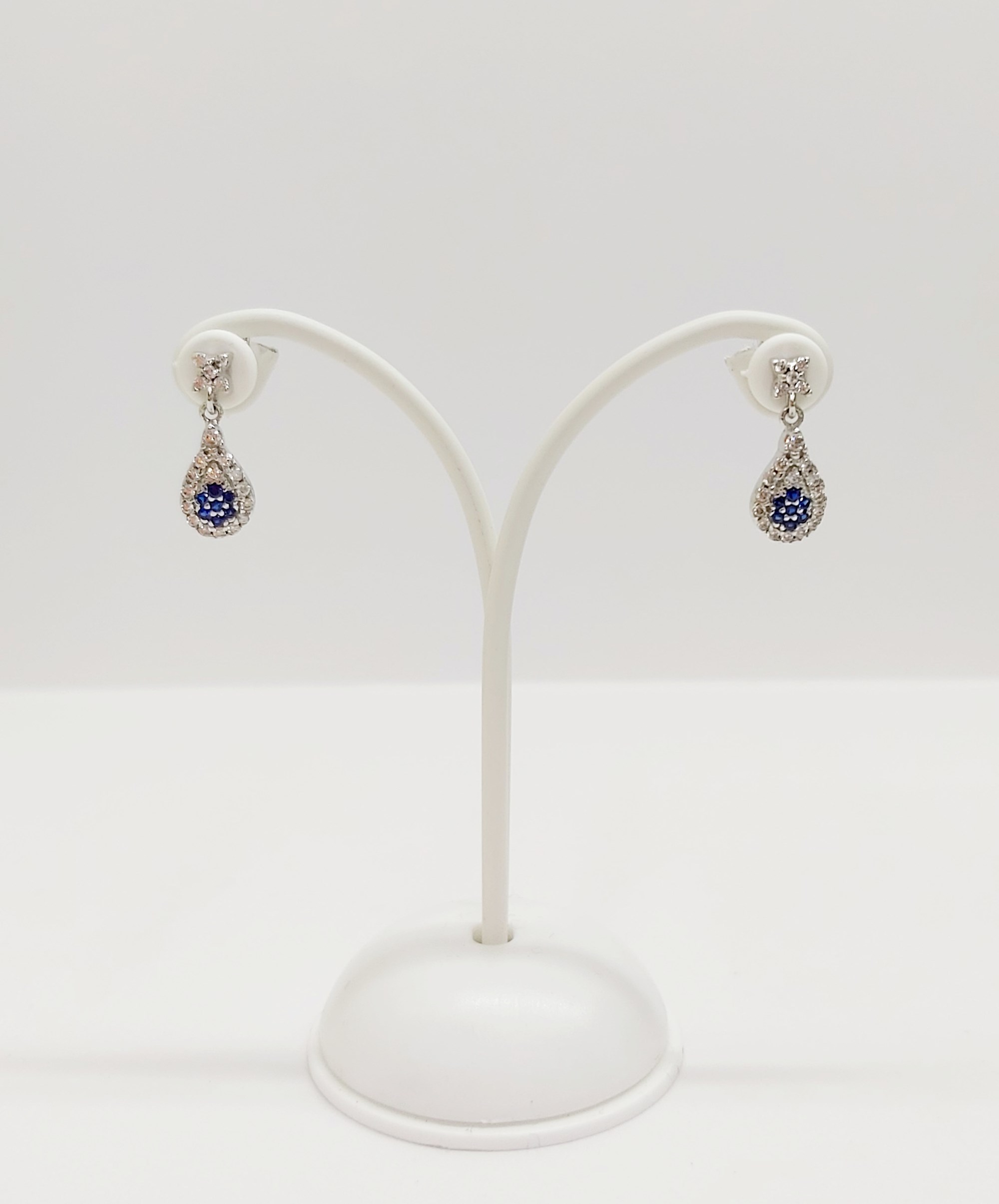 Orecchini pendenti in oro bianco con pietre bianche e blu.