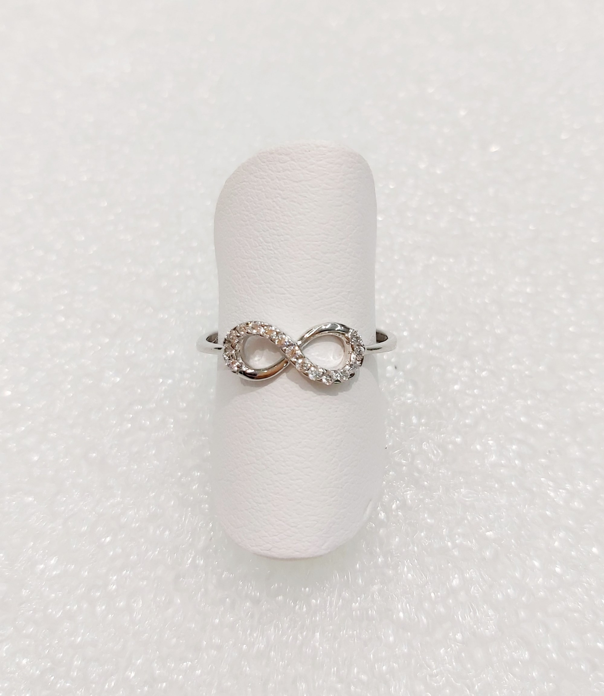 Anello in oro bianco con infinito e zirconi bianchi. Molto di tendenza, bello da indossare, giovanile. Adatto per un compleanno o per una laurea.