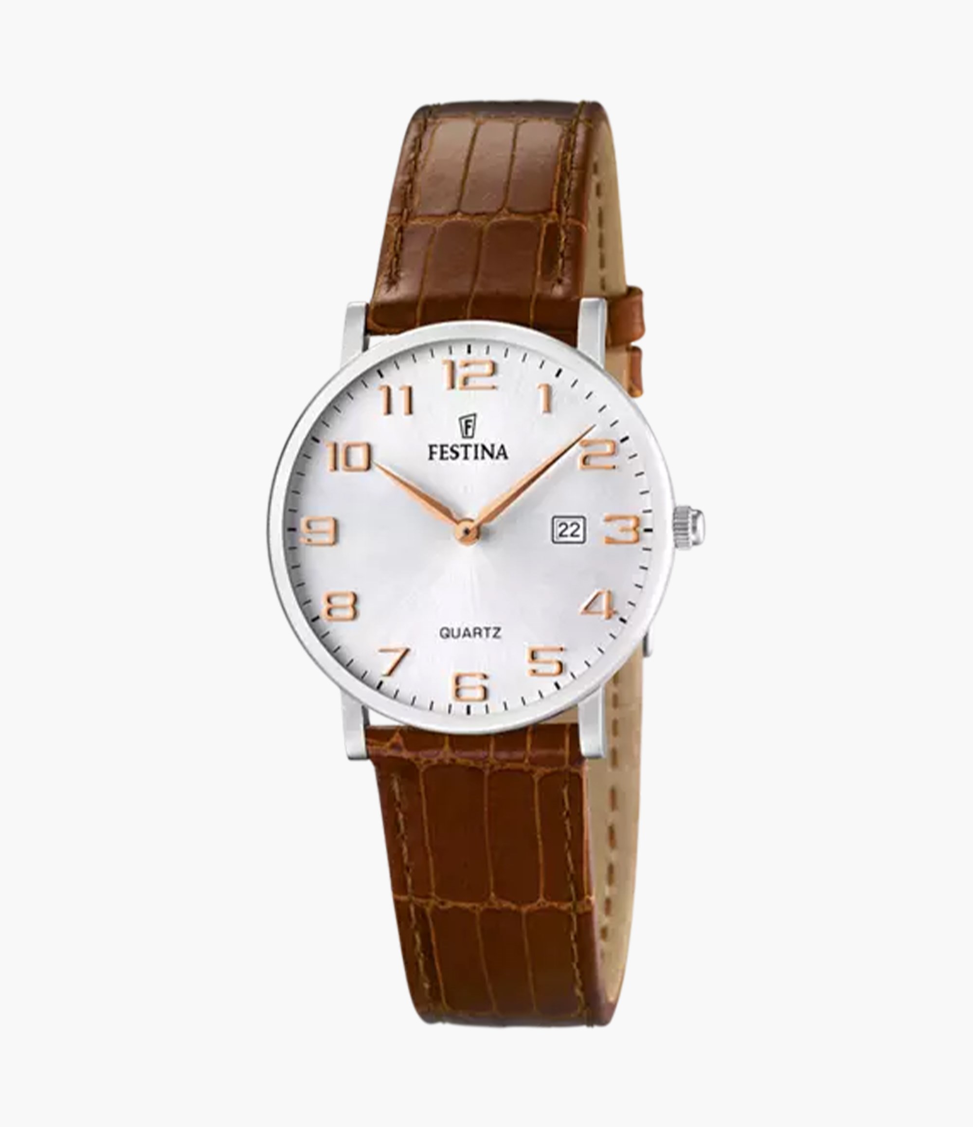 Orologio da donna Festina in acciaio e pelle con numeri. Diametro della cassa 30,5 mm. Resistente all'acqua 3 atmosfere. Semplice, elegante, funzionale. Un classico sempre attuale.