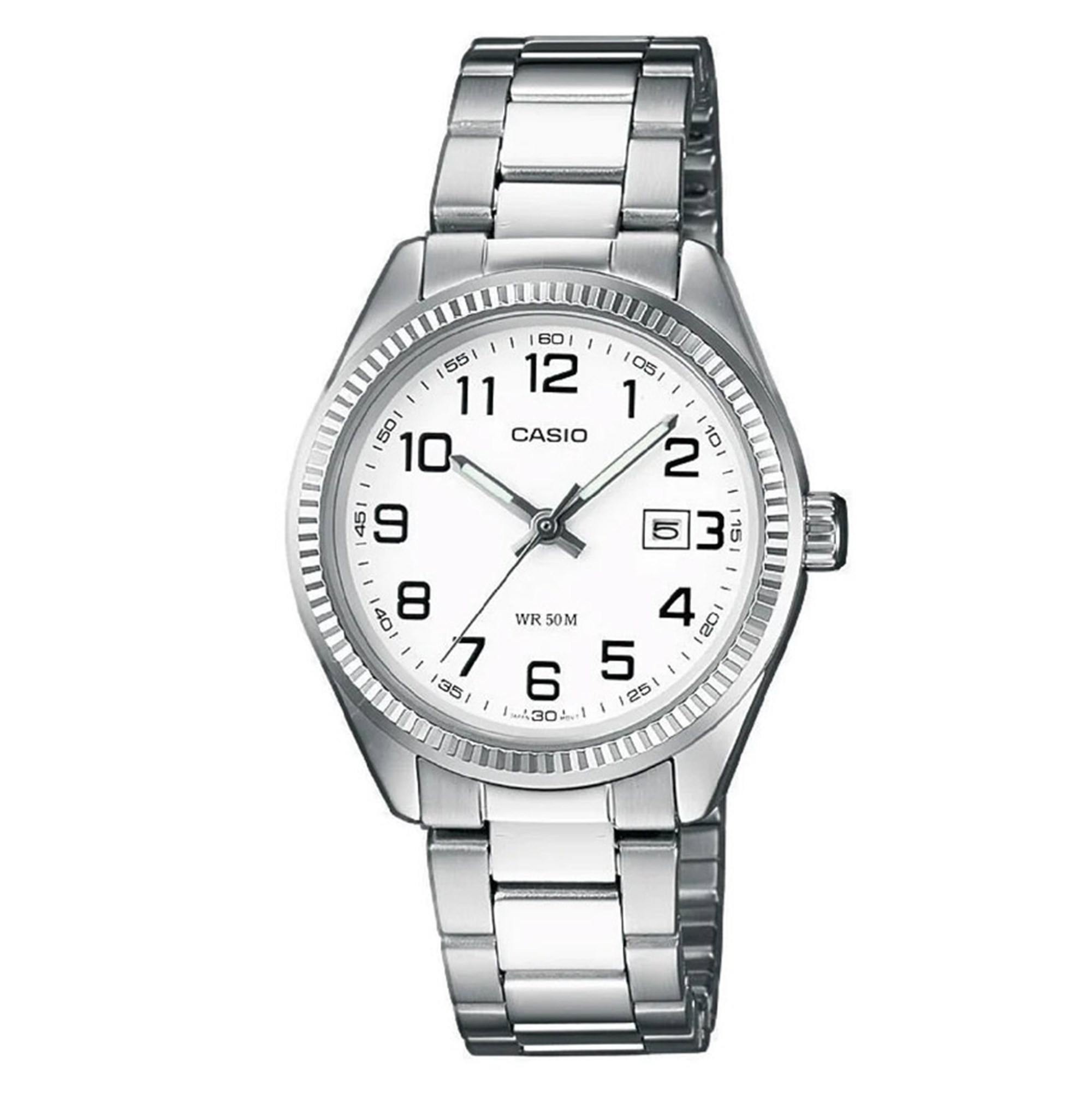 Orologio da donna Casio con quadrante bianco. Diametro della cassa 29 mm. Resistente all'acqua. Movimento al quarzo. Semplice e funzionale