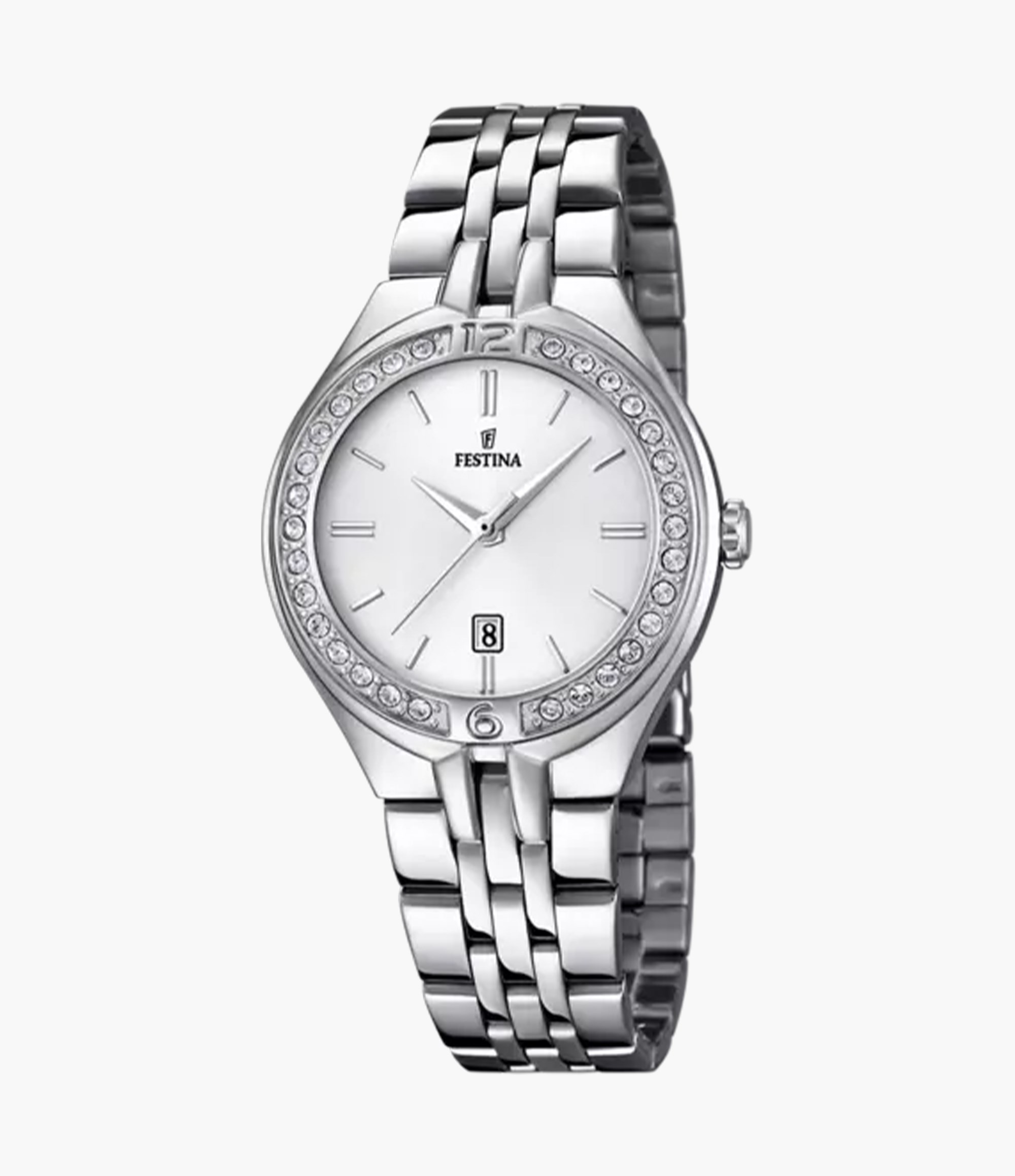 Orologio da donna in acciaio Festina con quadrante bianco e pietre sulla cassa. Diametro della cassa 30 mm. Resistente all'acqua 5 atmosfere. Movimento al quarzo. Elegante, raffinato e luminoso.