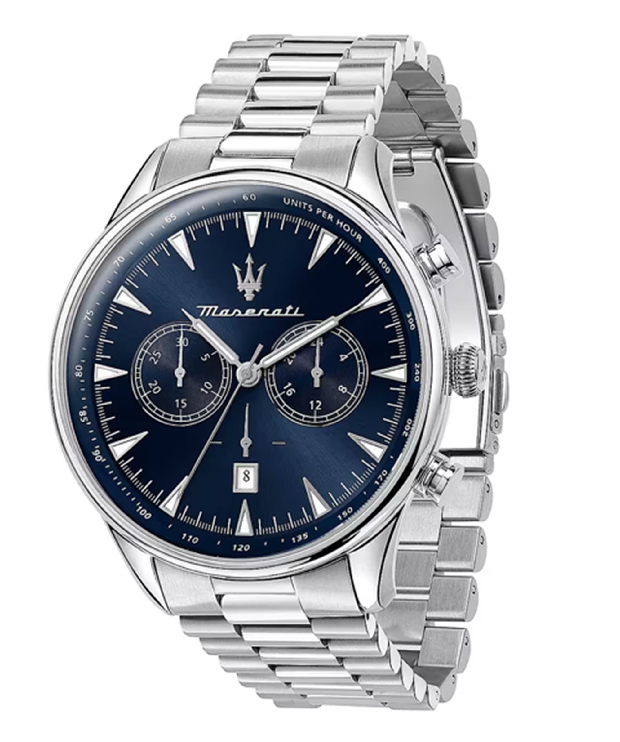 Orologio da uomo Maserati con cronometro, quadrante blu e cinturino in acciaio. Dimensioni della cassa 45 mm. Movimento al quarzo. Corona a vite. Resistente all'acqua 10 atmosfere. Elegante, raffinato, tradizionale ma sempre attuale.