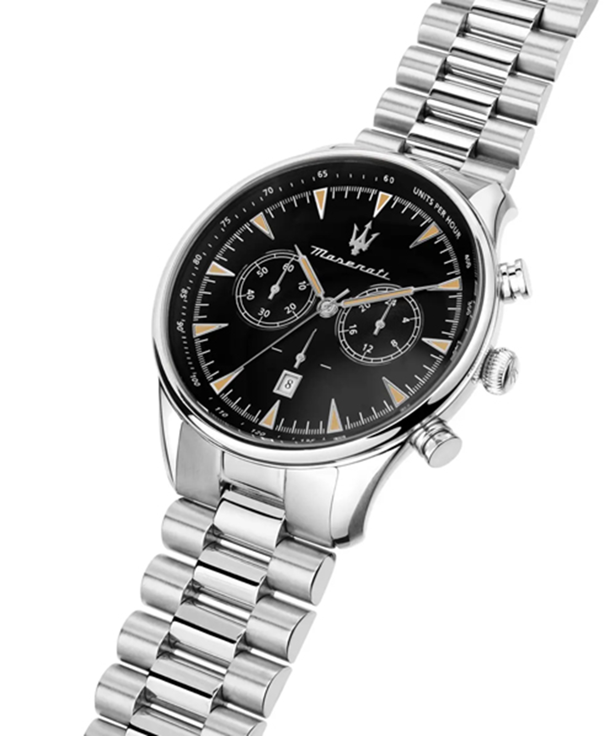 Orologio da uomo Maserati con cronometro, quadrante nero e cinturino in acciaio. Dimensioni della cassa 45 mm. Movimento al quarzo. Corona a vite. Resistente all'acqua 10 atmosfere. Elegante, raffinato, tradizionale ma sempre attuale.