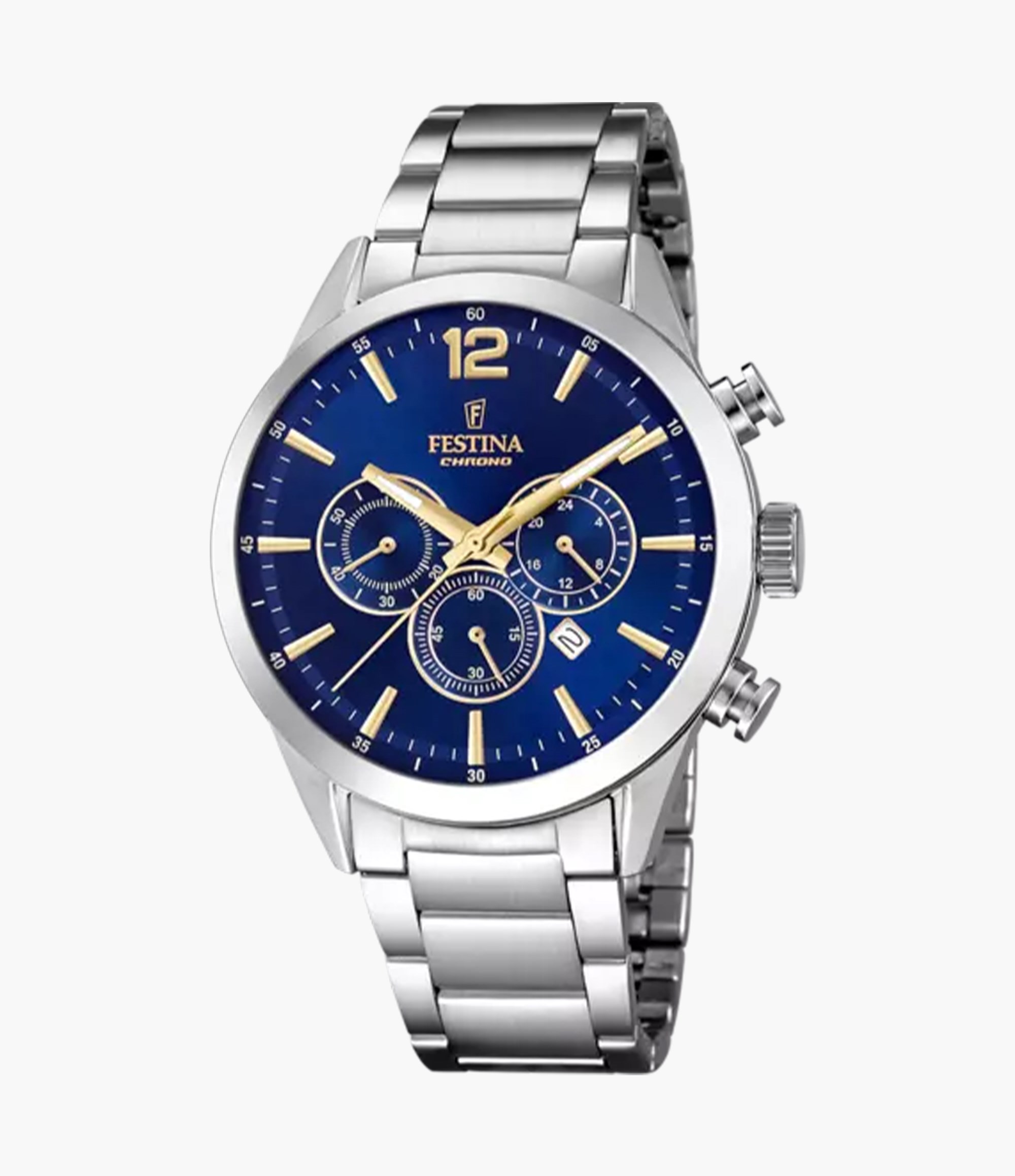 Orologio da uomo Festina in acciaio con cronometro, quadrante blu e indici dorati