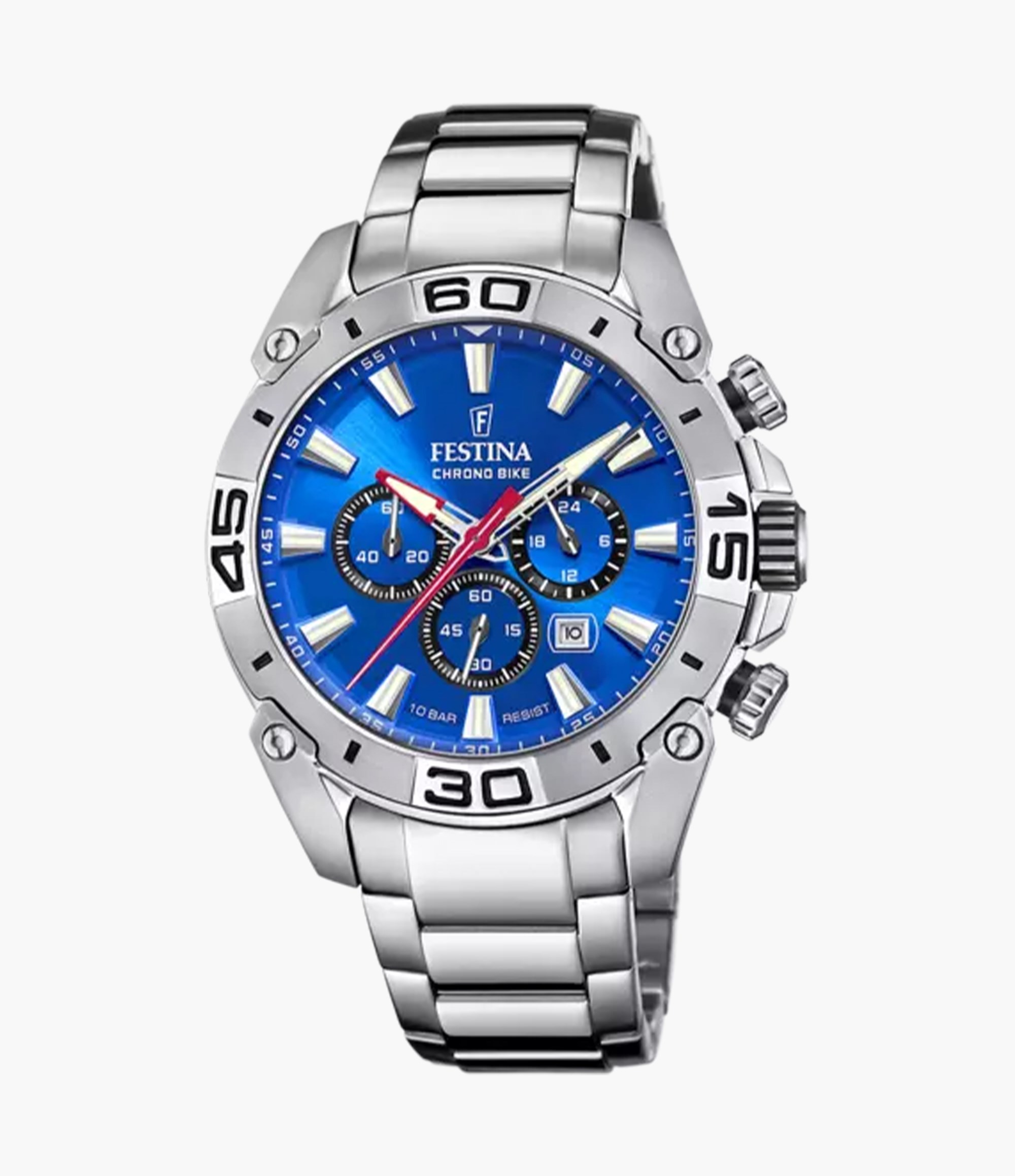 Orologio da uomo Festina in acciaio con cronometro, quadrante blu e indici dorati