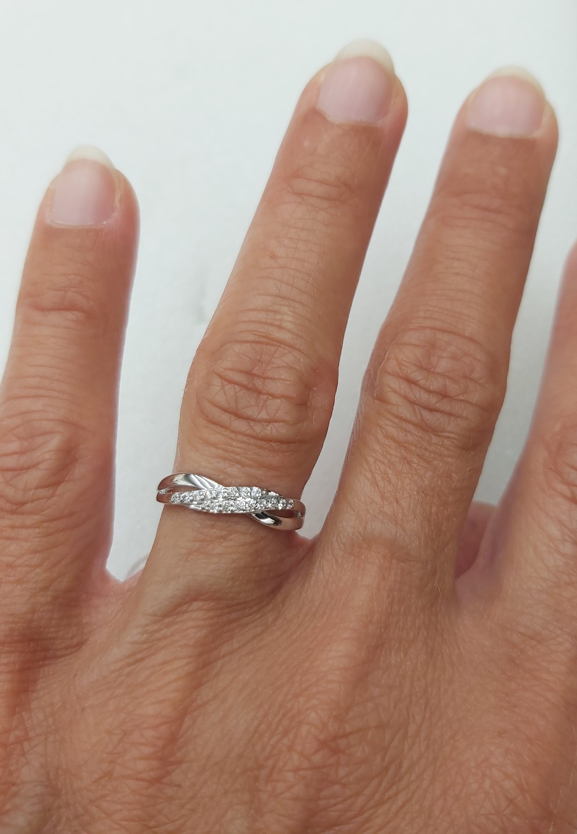 Anello a fascia in oro bianco con zirconi. Raffinato, luminoso, giovanile. Un'anello dal design moderno, perfetto come regalo per un compleanno o una laurea.