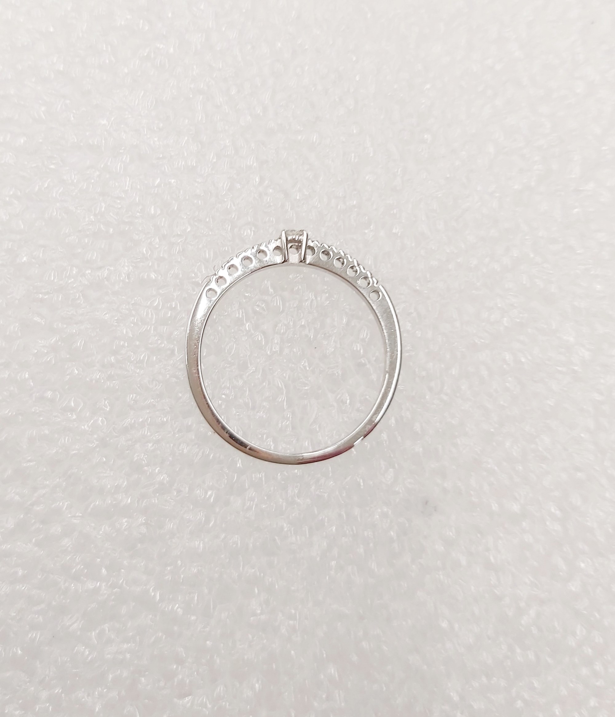Anello solitario in oro bianco con diamante centrale e diamanti sul gambo per un totale di carati 0,12. Elegante, luminoso, raffinato, giovanile. Un anello di fidanzamento perfetto per una giovane coppia.