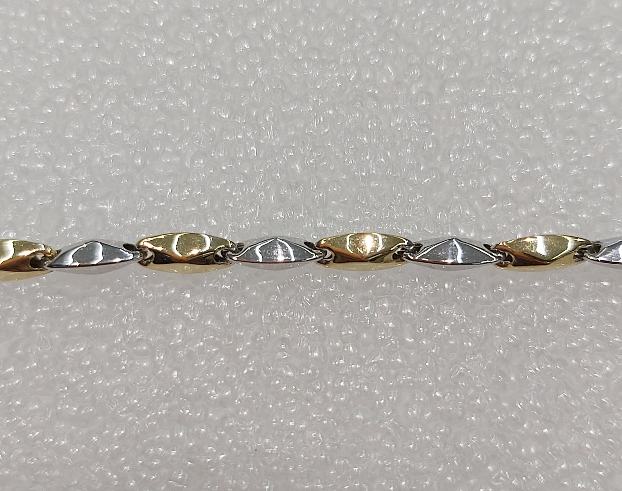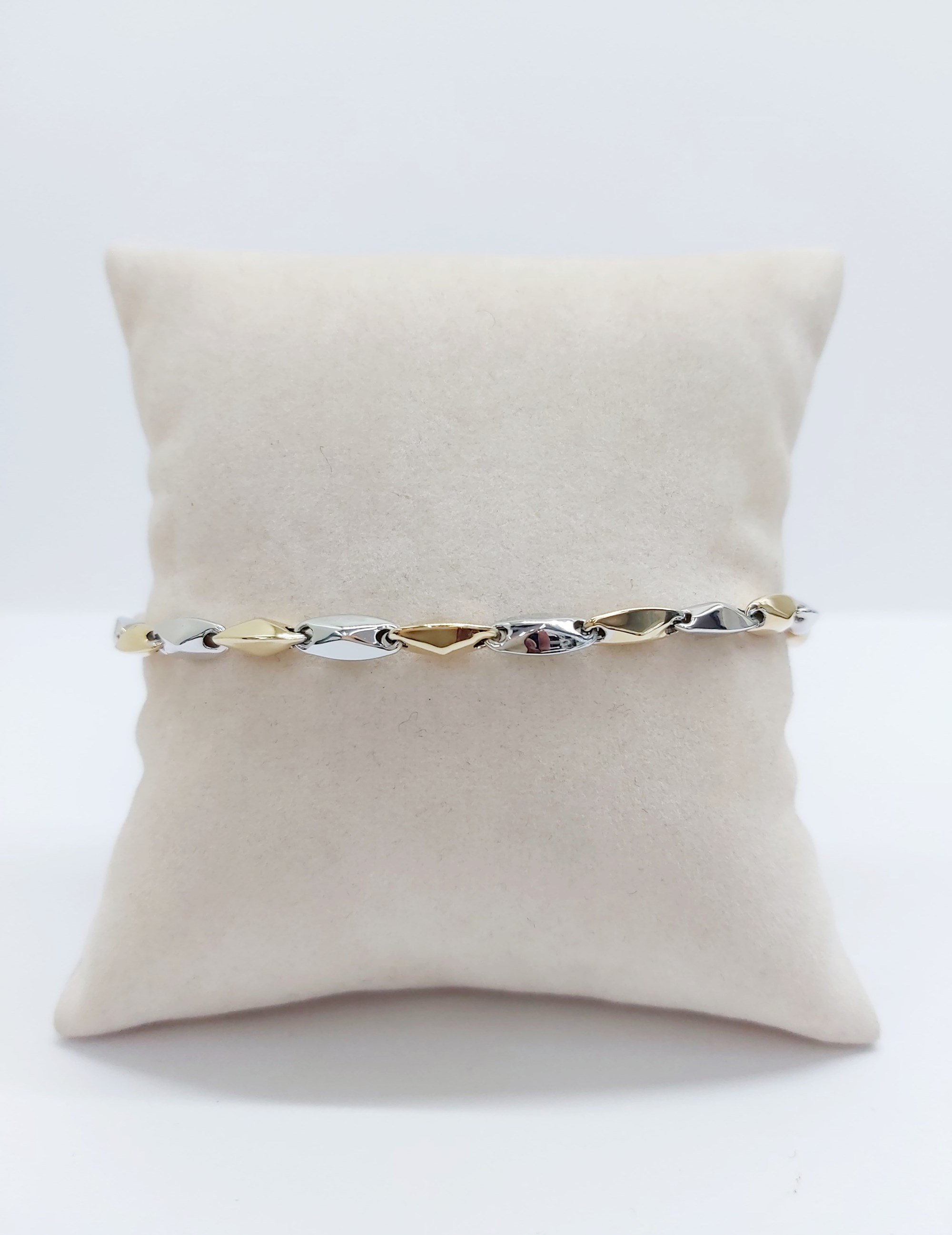 Bracciale in oro giallo e bianco con maglie a chicchi di riso. Elegante, luminoso e molto giovanile.