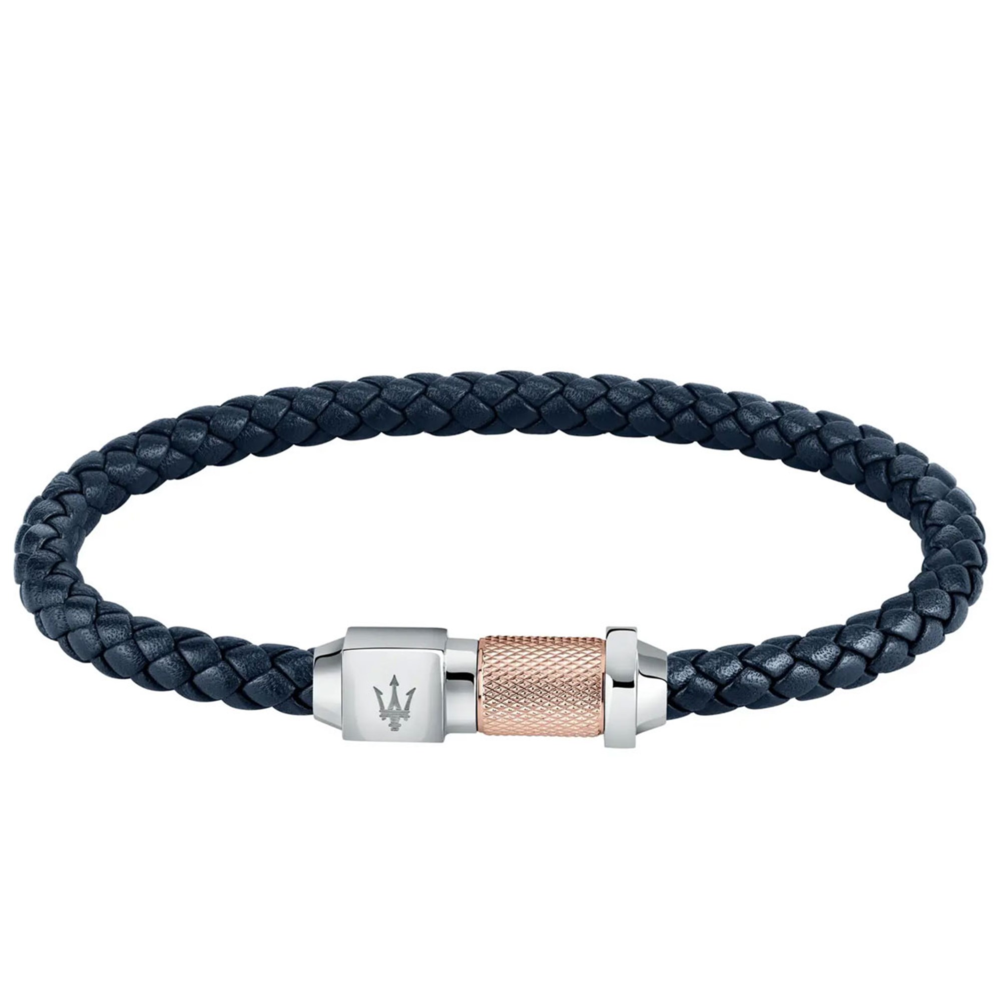 Bracciale Maserati da uomo in pelle blu e targhetta in acciaio e acciaio rosato. Sportivo, grintoso, giovanile ...