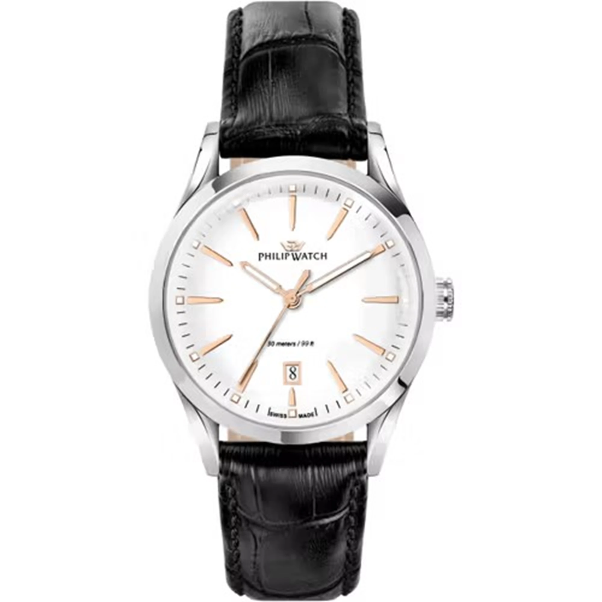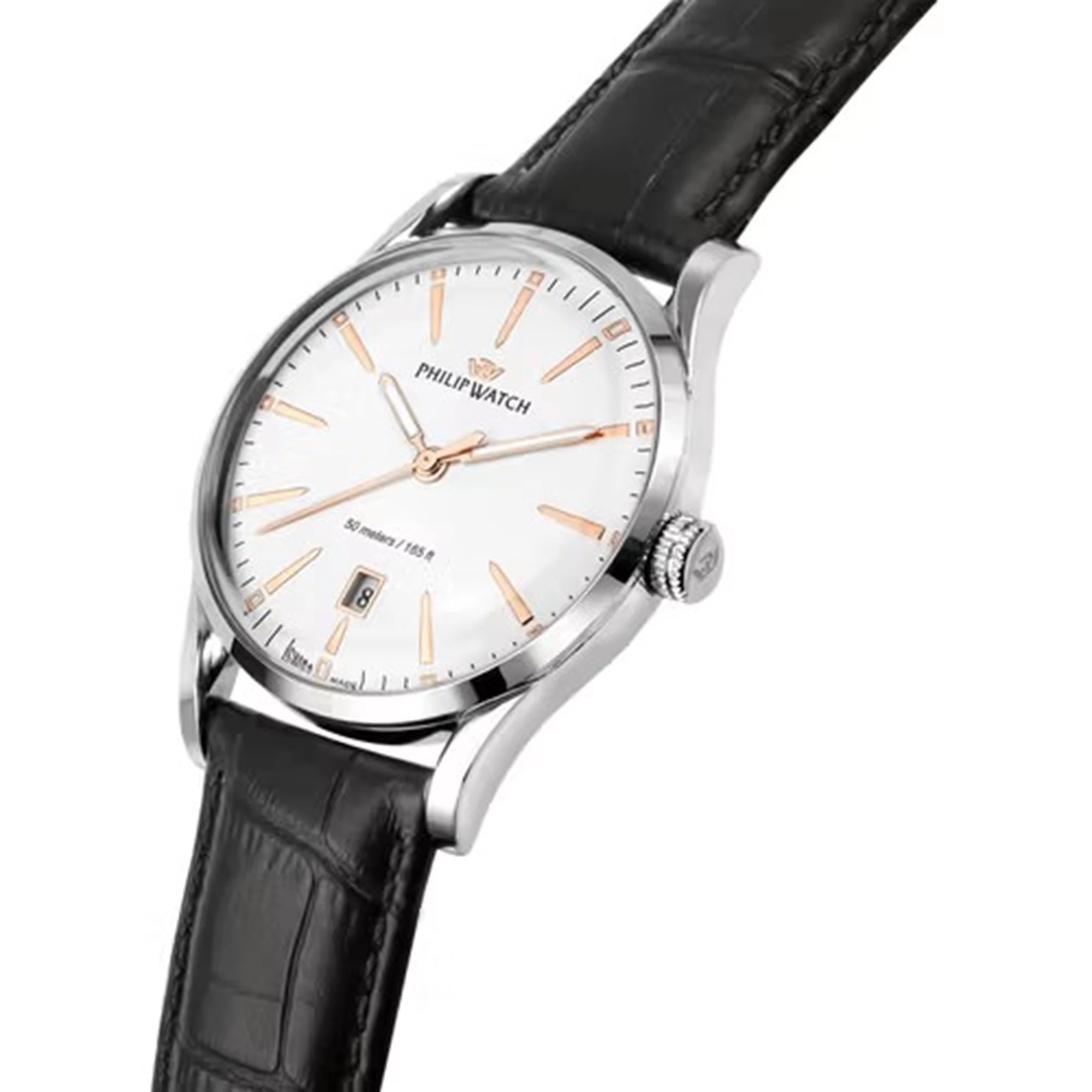 Orologio da uomo Philip Watch in pelle nera e quadrante bianco. Dimensioni della cassa 39 mm. Resistente all'acqua 3 atmosfere. Movimento svizzero. Elegante, raffinato, un classico senza tempo.