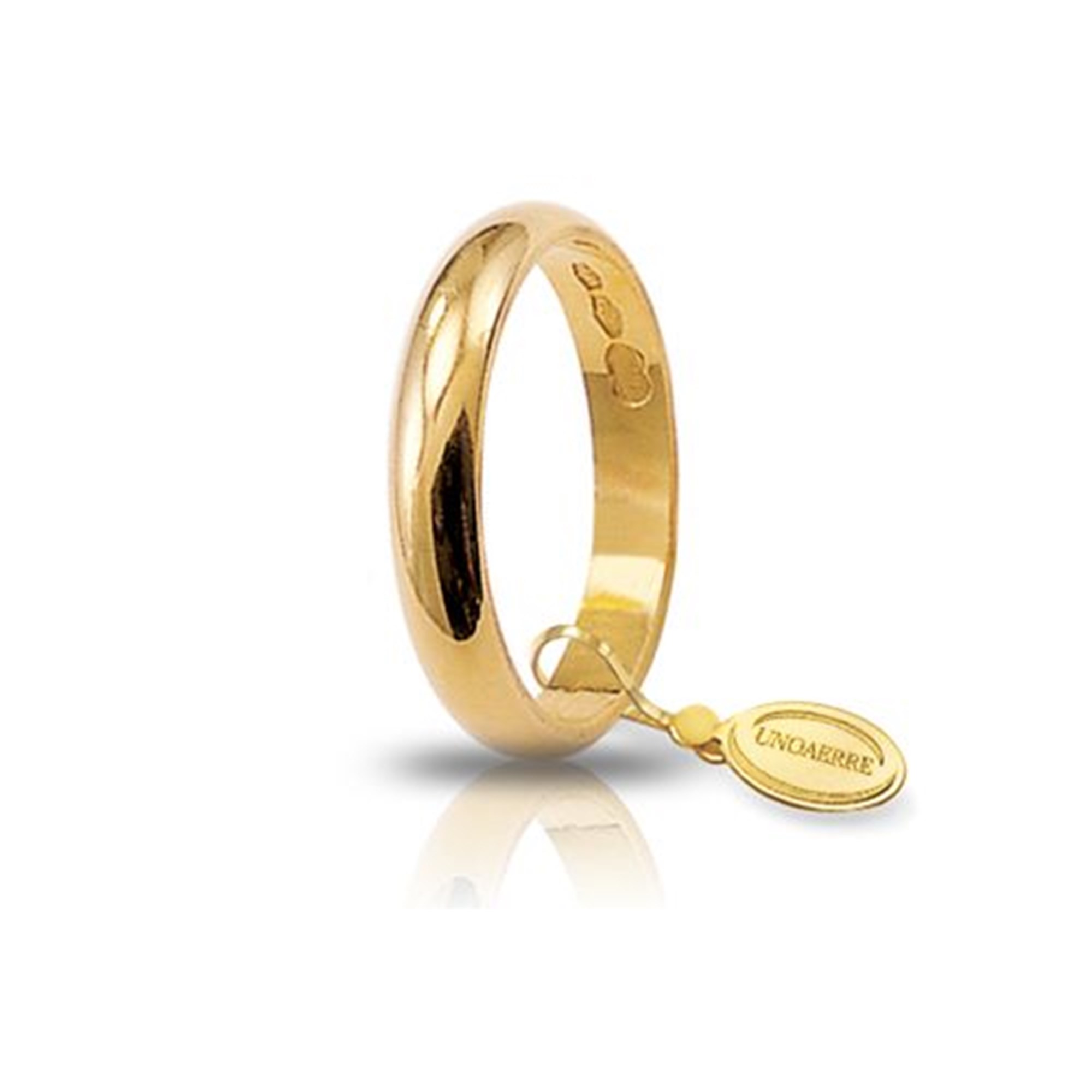Fede classica in oro giallo, spessore 4mm. Questo tipo di fede è di medie dimensioni, l'interno è piatto, adatta a tutti. La sua forma la rende adatta per essere impreziosita con un diamante